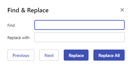 To find and replace text, choose Edit > Find & Replace. The dialog below will appear.