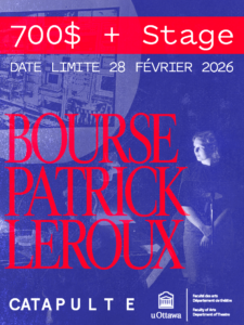 Chaque année, le Théâtre Catapulte remet une bourse de 700 $ à un·e étudiant·e du profil francophone en théâtre de l’Université d’Ottawa qui se distingue par son engagement.